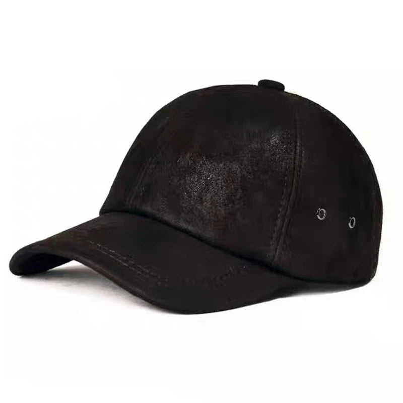 This cap offers durable comfort and a refined look with its genuine sheepskin suede construction. A classic baseball shape features a structured crown, curved brim, and subtle top button for everyday wear. The distressed gray finish provides a worn-in appearance while the soft suede delivers natural suppleness and light insulation suitable for cooler days.