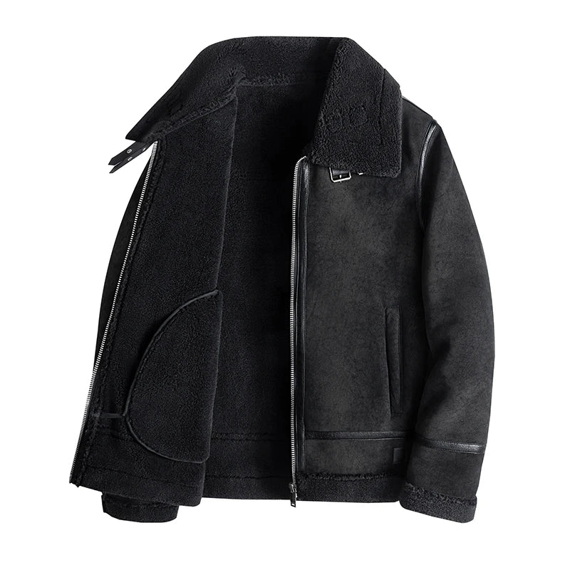 This shearling jacket provides insulating warmth with a soft interior lining for reliable comfort in cold conditions. A fur collar, zip front, and fur-trimmed cuffs create a structured silhouette that layers over shirts or sweaters. The smooth exterior adds durability while supporting easy mobility during daily wear.