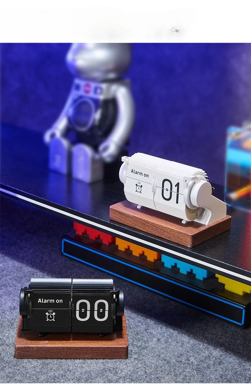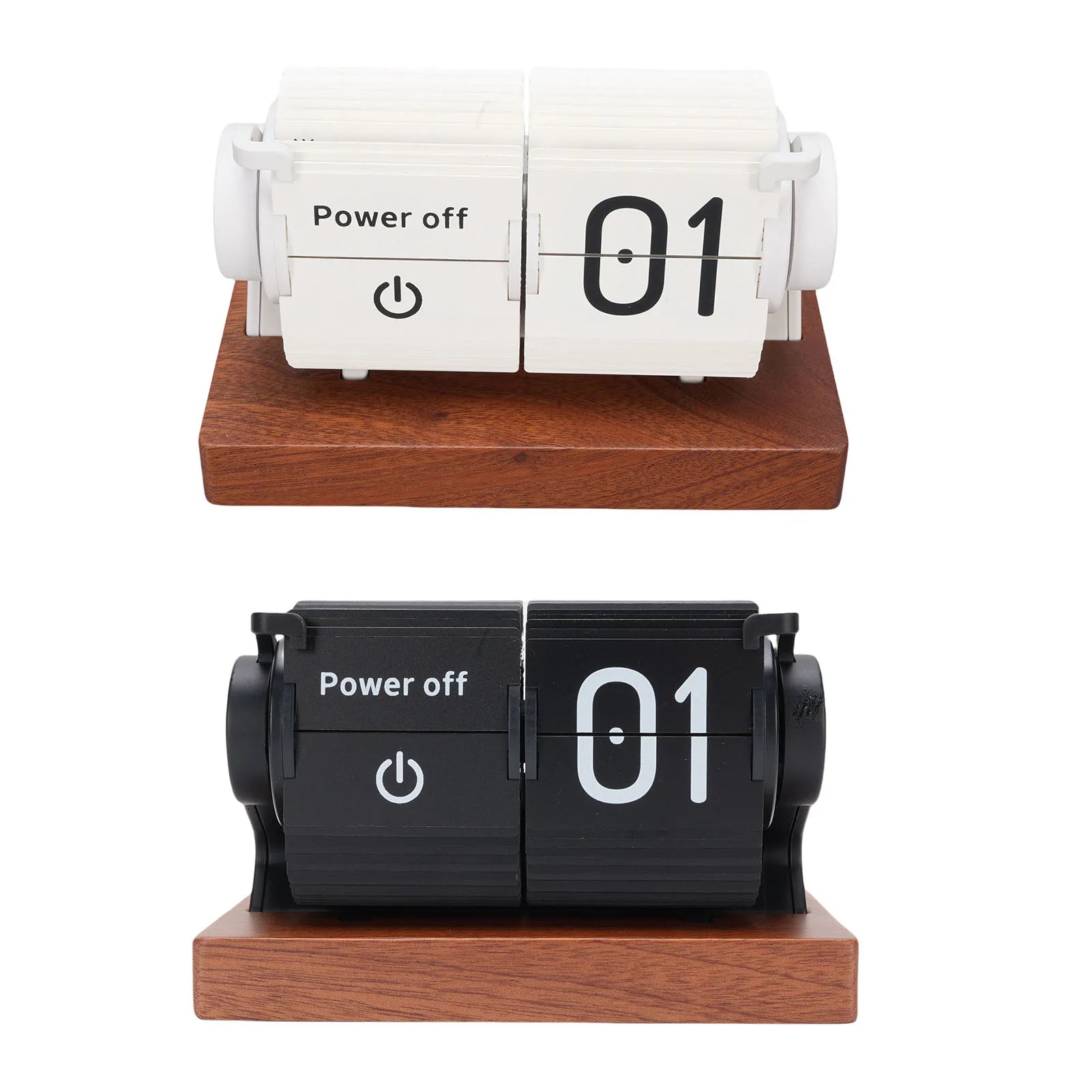 This desk flip clock offers precise mechanical timekeeping with a satisfying flip mechanism for easy reading at a glance. The clean rectangular body in matte black or white updates digits smoothly, while the integrated alarm indicator adds functional simplicity. Set on a sturdy wooden base, it brings reliable daily timing to any workspace without digital distractions.